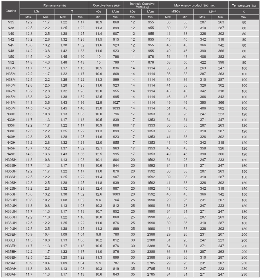The Grade of a magnet generally indicates how "strong" a magnet material is, which is measured by the Maximum Energy Product. The energy product is commonly specified in units of Gauss Oersted. The higher the grade the "stronger" the magnet. The grade also tells the temperature rating of a magnet material. Neodymium magnets have different heat tolerances which determine their maximum working temperature. As the heat tolerance increases the maximum available flux density decreases.